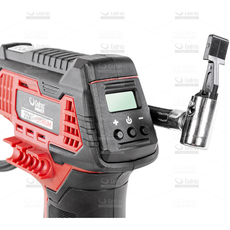 Kompresor posiada wyświetlacz pokazujący ciśnienie oraz 3 przyciski funkcyjne. Po osiągnięciu zadanego ciśnienia kompresor automatycznie wyłącza się.