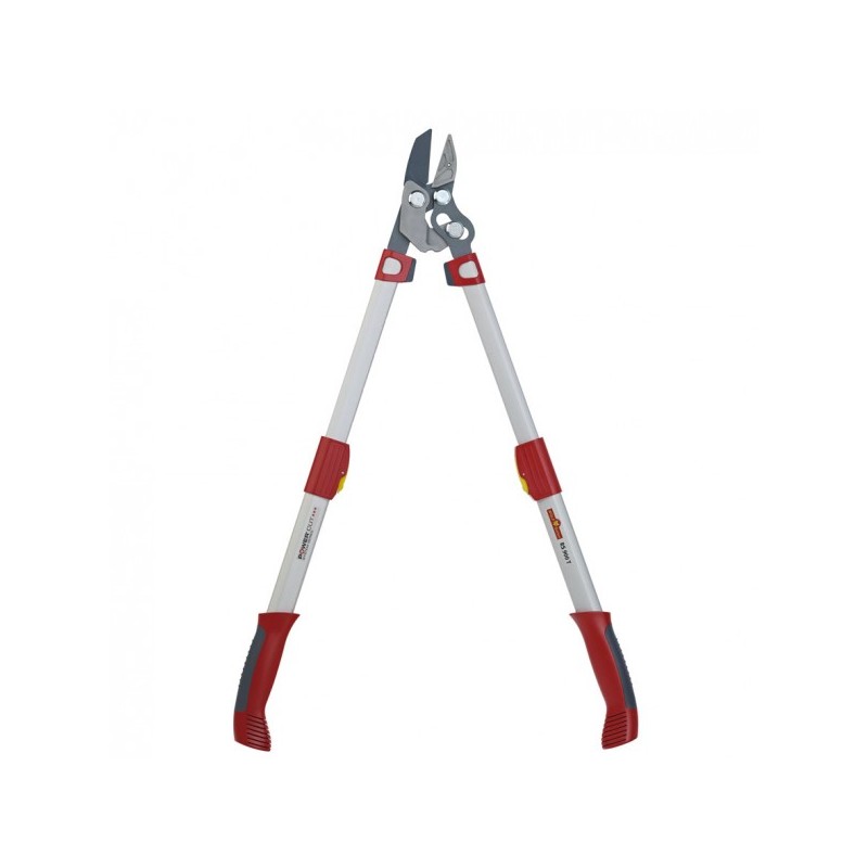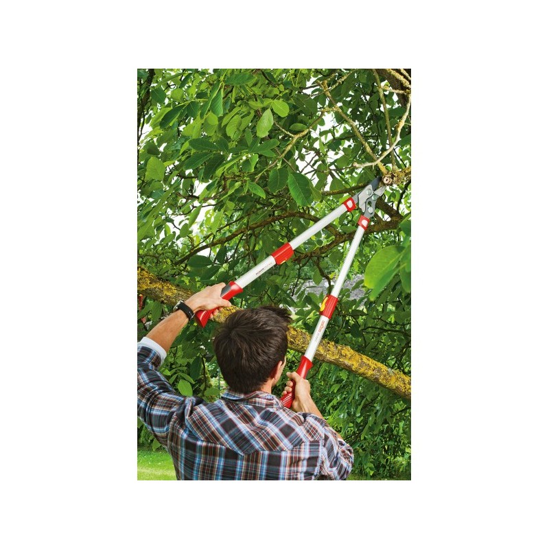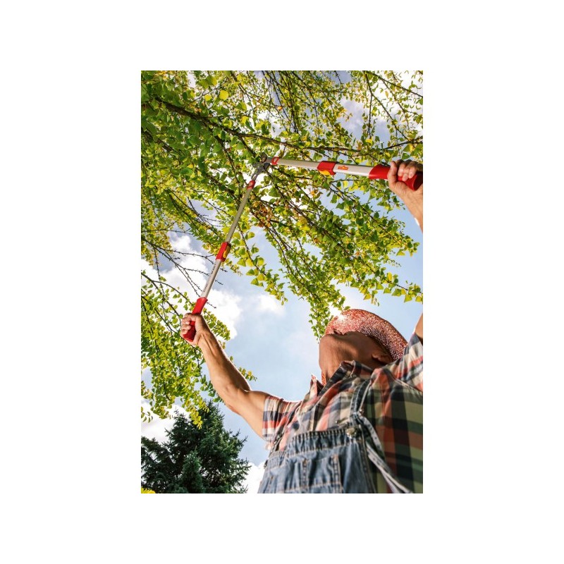 Ostrza narzędzia pokryte są powłoką antyadhezyjną chroniącą przed pokryciem ostrzy klejącym sokiem drzew, dzięki czemu każde cięcie przychodzi lekko i sprawnie. Dzięki nowemu rozwiązaniu zastosowaniu w głowicy tnącej uzyskaliśmy 4-krotnie lepsze przełożenie mocy niż w zwykłych sekatorach. Ergonomiczny, anodowany uchwyt z teleskopową regulacją długości zakończony jest wygodnymi rączkami pokrytymi tworzywem. Gumowe ograniczniki wewnątrz uchwytu chronią dłonie użytkownika przed udeżeniem oraz asystują w czasie pracy zapewniając maksymalny komfort. Sekatory z serii POWER CUT zbudowane są z wielu wymiennych elementów, dzięki czemu są niezwykle proste w utrzymaniu. Długość całkowita sekatora regulowana jest w zakresie 650-900 mm.