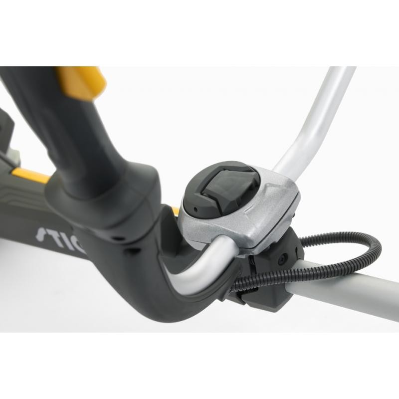 Obsługa jest więc szybka i prosta, pobór energii i zużycie są mniejsze, a urządzenie działa dłużej. Została wzmocniona w stylu podobnym do stosowanego w leśnictwie, dobrze wyważony silnik cechuje się niższym poziomem drgań, co pozwala na komfortową pracę. Kierownica typu dupleks gwarantuje komfort obsługi kosy i pełną kontrolę w każdych warunkach. Nowy wyświetlacz cyfrowy, umieszczony na uchwycie, dostarcza wszystkie potrzebne informacje oraz alarmy dotyczące pracy i konserwacji, aby zachować jakość i wydajność maszyny jak najdłużej. Kosa jest wyposażona w potrójne, metalowe ostrzem TRI ARC i najnowszej generacji głowicę dwużyłkową Tap&Go Easy Load, która umożliwia szybkie zwolnienie żyłki po przyciśnięciu głowicy do podłoża.